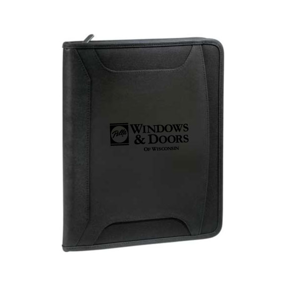 sku: Stock 8150-28BKZippered closure. Front cover pocket. Secure media panel holds all iPad models including the iPad Air, iPad mini, and most other e-readers and tablets. Stylus holder on media panel. Organizational panel features a USB port, five business card holders and three pen loops. Velcro® closure document holder. Includes 60 sheet 10" x 7.5" Case Logic® journal. Second location for journal on the media panel. Included information card lists the many functions of the padfolio.